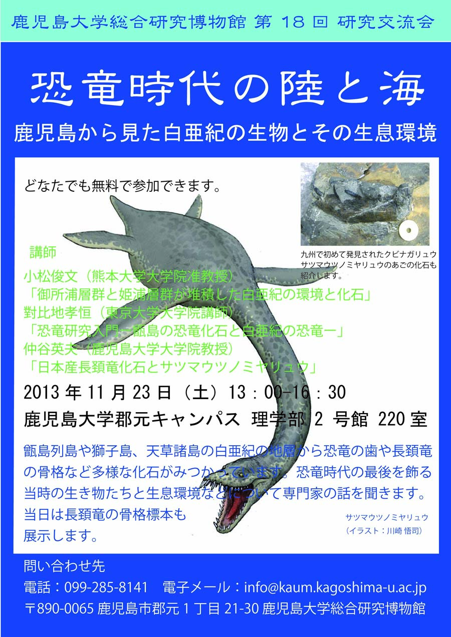 甑島列島や獅子島,天草諸島の白亜紀の地層から恐竜の歯や長頚竜の骨格など多様な化石がみつかっています。恐竜時代の最後を飾る当時の生き物たちの化石に触れ、それら生息環境などについて専門家の話を聞きます.