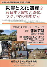 東日本大震災では数多くの文化財や博物館が被災しました。地震や津波以外に放射能汚染問題を抱えて復興への道のり厳しいフクシマの現実から、文化遺産の保護が地域の復興に果たす役割を考えます。□参加無料 |